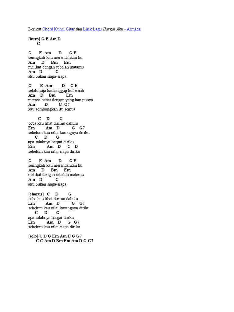 . KompilasiChord - Berikut adalah kunci gitar Armada - Hargai Aku yang kamu cari-cari lagu ini dapat kamu mainkan dengan mudah dengan mengganti nada dasar dan silahkan ganti chord sesuai dengan nada vokal kamu. C D G coba kau lihat dirimu dahulu Em Am D G G7 sebelum kau nilai kurangnya diriku C D Bm apa salahnya hargai diriku Em Am D G sebelum kau nilai siapa diriku Em Am D C DF-G sebe. Intro g e am d g g g e am d g e seringkali.